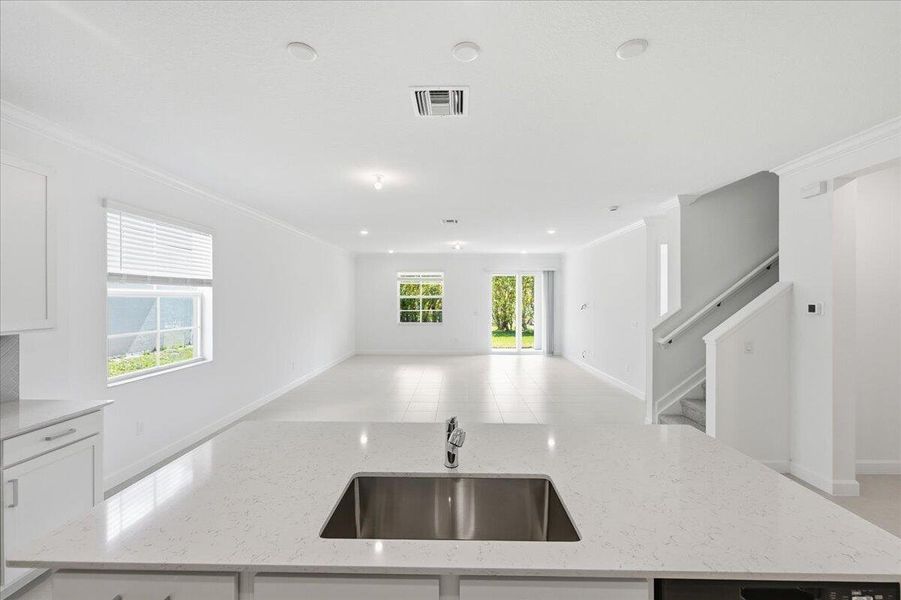 The heart of the home is the thoughtfully designed kitchen, highlighted by a central island that offers additional prep space, seating, and a natural gathering spot. On the exterior, the home boasts a 3-car garage
