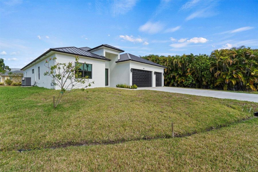 Stunning new construction home offering 5 bedrooms, 4 bathrooms, a 3-car garage and a durable metal roof. Interior features 10' ceilings, 8' doors, impact windows, custom closets, luxury vinyl floors, porcelain tile shower walls, with frameless shower glass doors and a Roman tub. Chef's kitchen boasts 2-toned modern European cabinetry, Samsung appliances and quartz counters tops and backsplash. Over 3,000 sq ft of modern open living space with premium finishes throughout. Spacious backyard ideal for a future pool in the desirable Southbend area. Minutes to I-95 and Turnpike, close to shopping centers, banks and much more.
