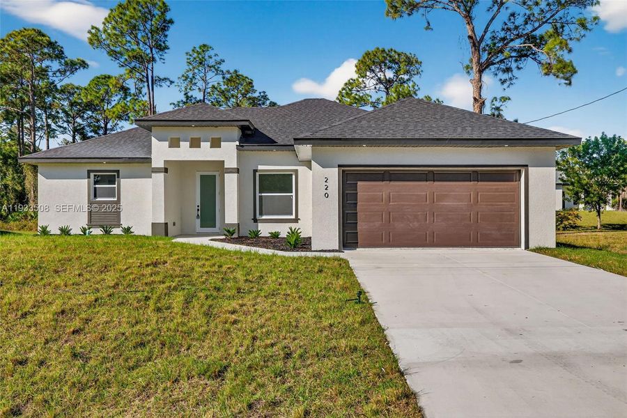 Seller offering closing cost assistance with a full-price offer, seller concessions/contribution toward buyer closing costs. Move-in ready new construction with Certificate of Occupancy issued and immediate occupancy available. This newly constructed home offers exceptional value for a 4-bedroom new build in Lehigh Acres and is built on an elevated pad for added peace of mind. Located at 220 Lomax Ave S, the property sits on a quarter-acre lot and features 4 bedrooms, 2 bathrooms, a 2-car garage, and a covered lanai. The open-concept layout is designed for comfort and durability, highlighted by 14-foot ceilings in the foyer and 11-foot ceilings in the great room and primary suite, creating a spacious feel rarely found in comparable homes. Interior finishes exceed standard builder-grade specifications and include porcelain tile flooring throughout, impact-rated windows and doors, a cohesive interior design package, and smart mirrors in the bathrooms. The kitchen features quartz countertops with a full-height matching quartz backsplash, upgraded wood cabinetry, dedicated pantry, large center island, stainless steel appliances, and a smart refrigerator with integrated display. Primary suite with a walk-in closet and installed shelving, a laundry room with utility sink, a professionally finished epoxy garage floor, and a full sprinkler system. Easy access to I-75, Ft Myers, SW Florida International Airport, shopping, dining, and schools. Easy to show.