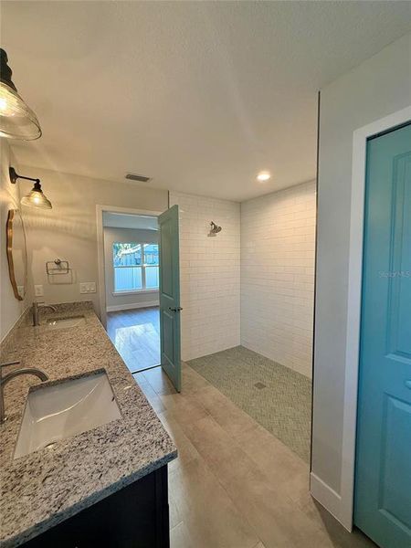 The primary suite features a large walk-in closet, a private en-suite bath with custom tile finishes, a large walk in shower, and a large double vanity with granite counter tops. while the secondary bathroom presents an oversized vanity with granite countertops, and a tub/shower combo with designer tile surround.