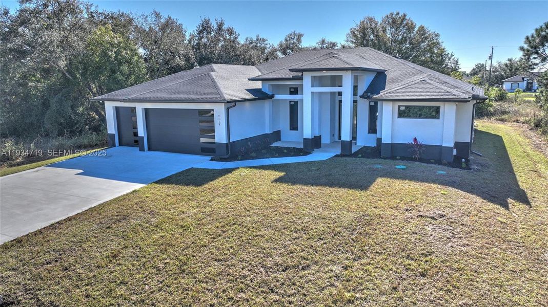 From the moment this newly constructed residence comes into view, it's clear this home was built with purpose. A striking facade, and a 3-car garage set the stage for what lies beyond. Step inside and you're welcomed by soaring ceilings, polished finishes, and a sense of quiet luxury that flows effortlessly throughout nearly 2,800 square feet under air. This 5 bedroom, 3 bath home unfolds thoughtfully with a split bedroom layout that balances openness and privacy. At the heart of the home, the kitchen stands as a gathering place. Equipped with modern appliances, a traditional stove, a wall oven, expansive counter space and an oversized walk-in panty designed to handle everyday living with ease. The primary suite tells its own story of retreat and refinement. Generously sized, it offers dual oversized walk-in closets and a spa-inspired bathroom featuring a two-person jetted jacuzzi tub, a walk-in shower with dual entry and dual shower heads, and custom his and hers vanities with touch activated modern mirrors and a dedicated makeup station. Every detail was elevated with a whole home sound system extending through the primary suite, living areas, kitchen and lanai, because comfort should be heard as well as seen. Conveniently located within a short drive to Fort Myers, this home blends modern construction with every day convenience.