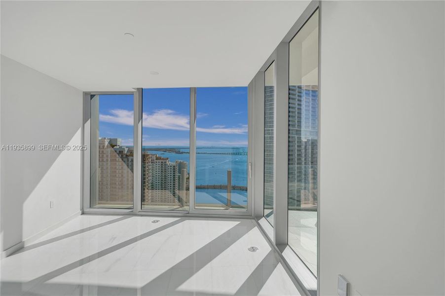 Experience unparalleledd luxury in this 2-bedroom + den, 3.5 bath condo, with mesmerizing panoramic water views. Situated in the iconic Aston Martin Residences, this home features expansive floor-to-ceiling windows that fill the space with natural light, creating a serene ambiance. Elegant Thassos marble floors and sleek finishes highlight the refined design. Gourmet kitchen with top-tier Gaggenau appliances, complements the spacious living areas and a large private balcony. Enjoy 40,000 sqft of exclusive amenities, including an art gallery, VIP lounge, 2-story fitness center, spa, sauna, indoor and infinity pools, two cinemas, and premium concierge and valet services. This waterfront haven perfectly blends sophistication, comfort, and vibrant city living