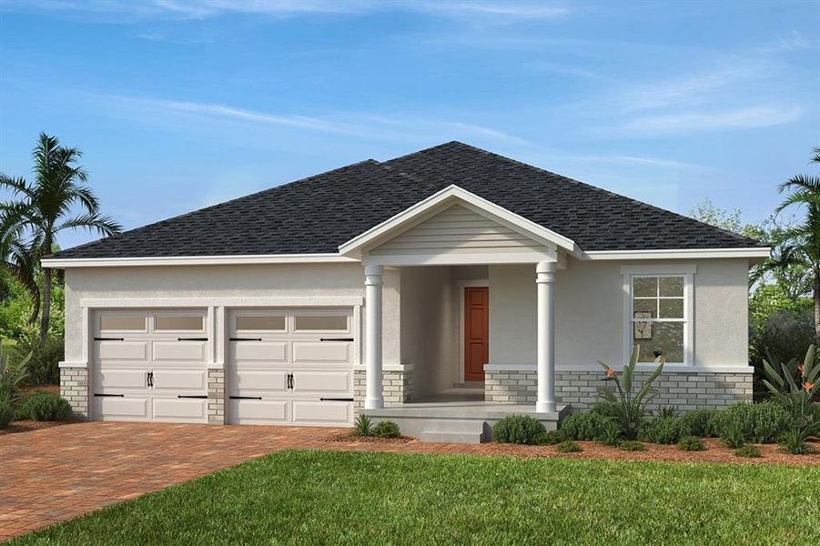 Built by a leading new home builder in Orlando, Florida, this charming single-story home features an open floor plan with sleek tile flooring and soaring volume ceilings in the spacious great room, ideal for everyday living and entertaining. The thoughtfully designed kitchen offers granite countertops, a center island, 36-in. upper cabinets, Moen® faucet, Kohler® stainless steel sink, and Whirlpool® stainless steel appliances. The private primary suite provides a relaxing retreat with plush carpeting, a walk-in closet, and a well-appointed bath featuring a dual-sink vanity, linen closet, and walk-in shower with tile surround. Enjoy outdoor living on the peaceful covered back patio, perfect for gatherings or quiet evenings, making this home a standout among new construction homes in the Orlando area.