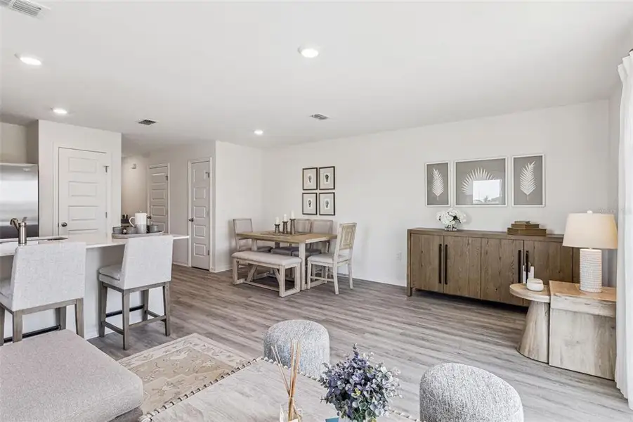 The heart of the home, a sprawling living space, beckons with its ample room and abundant natural light. Whether entertaining guests or enjoying a quiet night in, this versatile area adapts effortlessly to your lifestyle needs. Adjacent to the living space lies the dining nook and gourmet kitchen, a chef's delight adorned with sleek cabinetry, premium stainless-steel appliances, and a stunning center island. Gather around the island for casual meals or culinary adventures, as the kitchen effortlessly blends style with functionality.