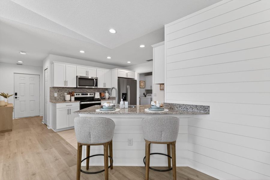Discover true Florida living in the 2-bedroom, 2-bath Sterling model featuring a spacious layout, soaring vaulted ceilings, a covered front porch, and attached garage. Built with solid concrete block, this home boasts quartz counters, stainless steel appliances, and elegant finishes. The split-bedroom design ensures privacy while the open living area flows perfectly for entertaining. This move-in-ready home was built with 3/16th true plywood roof sheathing, hurricane tie straps, R-30 insulation, and hip roof designs ensuring big insurance premium discounts. Our homes also come equipped with energy efficient appliances, keypad door locks, and a continuous quartz kitchen backsplash. Guaranteed Fixed long term land lease: $499/month for 99 years.