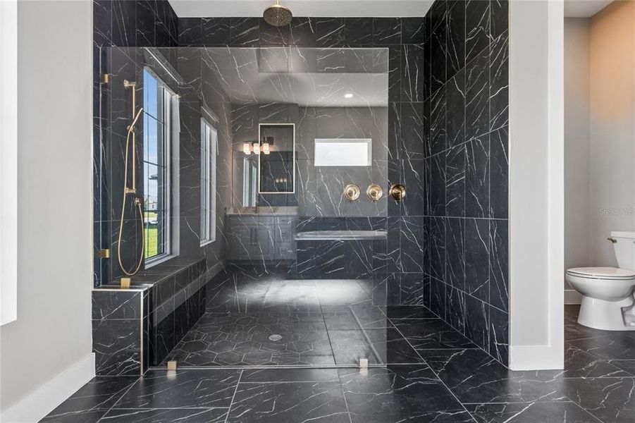 The owner’s suite occupies its own wing of the home, offering privacy and luxury. A spacious bedroom leads into a well-appointed owner’s bath with a garden tub, dual vanities, a large walk-in shower, and a private water closet. Two expansive walk-in closets complete this serene retreat.