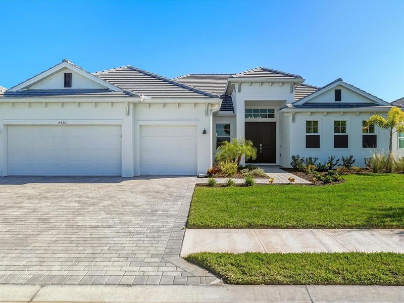 This stunning, gently occupied Estate Home offers 3 bedrooms, 3 full bathrooms, a dedicated office, and a 3-car garage, in the gated community of Palm Lake at Coco Bay. Boasting 2,650 sq ft of refined living space, this residence seamlessly blends elegance, comfort, and thoughtful design.Step through the double-door entry into a dramatic 12-foot ceiling foyer, where you’re immediately captivated by the home’s impressive scale and breathtaking 90-acre lake views. The outdoor living space is the perfect setting to unwind while enjoying abundant wildlife and tranquil water views.Inside, the open, split floor plan is anchored by a spacious 23’ x 23’ Great Room, highlighted by a grand tray ceiling.The chef-inspired kitchen is a showstopper, featuring a massive 12-foot island, quartz countertops, solid wood soft-close cabinetry & under-mount lighting, closet pantry, built-in convection oven and microwave, cooktop with range hood, dishwasher, and side-by-side refrigerator—ideal for both entertaining and everyday living.Throughout the home, you’ll find porcelain tile flooring, recessed lighting, elegant volume ceilings (11’ in the Great Room & Primary Suite, 10’ elsewhere), window blinds, ceiling fans and lighting in all bedrooms, dining room, and office, and 8-foot hurricane-impact doors and windows, including all sliding glass doors—providing peace of mind.The Primary Suite is a private retreat with direct access to the 33’ x 10’ covered lanai, two spacious walk-in closets, both featuring custom built-in shelving and drawers—one beautifully finished in gray solid wood, the other in white cabinetry complete with a built-in vanity. The spa-like en-suite bath offers dual quartz vanities, a linen closet, private water closet, and a fully tiled 7’ x 9’ glass-enclosed shower, creating a luxurious, resort-style experience.A Junior Primary Suite offers its own en-suite bathroom with quartz countertop, a fully tiled glass shower, a 5’ x 9’ walk-in closet, and direct access to the lanai.Storage abounds with extensive cabinetry throughout, a hallway closet, a 9-foot laundry closet with built-in cabinetry, additional laundry room cabinets, and a 3-car garage with a 10-foot ceiling, ideal for overhead storage racks. Stylish black cabinetry in the dining room adds a unique designer touch and extra functionality.Modern conveniences include smart front door entry, smart thermostat, and smart garage door openers. Exterior highlights include a tile roof, paver driveway and walkway, epoxy-coated garage floor, and full professional landscaping surrounding the home.Built for longevity and efficiency, this home features cement block exterior construction, a hip roof design for long-term insurance savings, and off-ridge roof venting for enhanced storm durability.Palm Lake at Coco Bay is a boutique community of just 175 homes, and this is the LAST Estate Home available. Situated on an 80’ x 130’ lot—the largest offered—near a cul-de-sac, it provides privacy and minimal traffic. The low monthly HOA fee of $312 includes lawn care, landscaped bed maintenance and mulching, internet, fitness center, playground, pickleball courts, clubhouse, and community pool. Sidewalk-lined streets make it ideal for walking, visiting neighbors, and outdoor play.