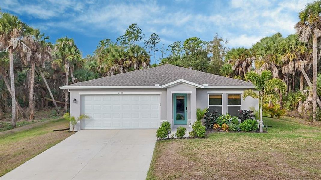 PLEASE SEE THE 3D INTERACTIVE TOUR OF YOUR NEW HOME! Experience the best of Southwest Florida in this pristine, 2024-built home situated in the heart of North Port—recently named the 2nd fastest-growing city in the U.S. This home features over 1650 sq/ft of living space, 3-bedrooms, 2-bathrooms plus a study on a double lot! Step into an airy, open-concept floor plan designed for effortless entertaining. The chef’s kitchen is the centerpiece, boasting sleek wood cabinetry, granite countertops, stainless steel appliances, and a convenient under-sink reverse osmosis system. The main living areas feature elegant luxury vinyl flooring for easy maintenance, with plush carpet in the bedrooms for ultimate comfort. The primary bedroom is a private retreat offering ample space for a king-sized set and more. The spa-like primary bath features dual sinks, granite counters, a spacious walk-in shower, and a large walk-in closet. Bedrooms 2 and 3 are bright and airy, the study is being used as a home office but can be easily be converted to a 4th bedroom by adding closet doors. The guest bath features granite counters and a shower/tub combo. Situated on a double lot, this property offers rare privacy and potential. The additional lot has already been partially cleared, providing the perfect canvas for a massive pool, a workshop, or a tropical estate. Enjoy your morning coffee on the screened lanai overlooking your private outdoor space. Full gutters (front, back, and sides) and hurricane shutters for peace of mind. Two-car garage currently optimized as a professional-grade workout room. Unbeatable location close to shopping, dining, Atwater Park with splash pad and the vibrant amenities of Wellen Park.