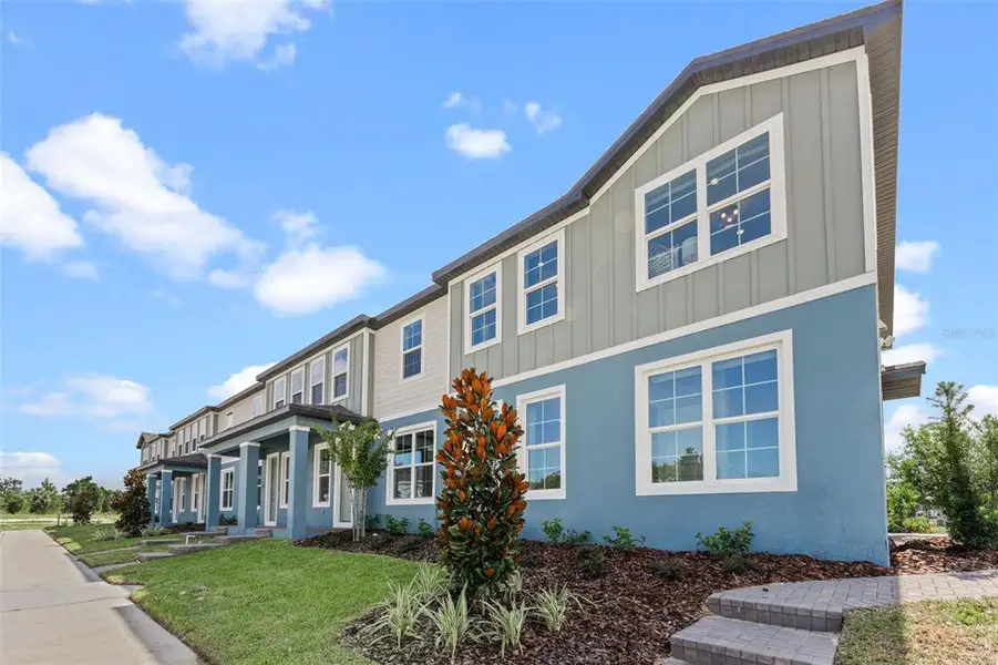 Move-In Ready. This move-in ready Amity is a stunning 4-bedroom corner townhome with an oversized two-car garage and paver driveway, located in the amenity-rich Eden Crest community in Apopka. Enter through the impressive 8’ front door and step into a bright, open-concept layout featuring 9’4” ceilings on the first floor and luxury vinyl plank flooring throughout the main living spaces. The spacious kitchen, dining, and great room flow seamlessly—perfect for everyday living and entertaining. The first-floor primary suite offers a private retreat with a dual-sink vanity with quartz countertops, a floor-to-ceiling tiled shower with glass enclosure, and a generous walk-in closet. The gourmet kitchen is both stylish and functional, showcasing 42” white cabinets with hardware, stainless steel appliances, sleek white quartz countertops, and an oversized center island ideal for gathering. The light-filled great room and dining area overlook your private 24’ x 15’ paver courtyard, perfect for relaxing or hosting guests, with convenient access to the garage. Upstairs, enjoy a spacious loft ideal for a media room, home office, or homework space, along with a full laundry room, full bathroom, and three generously sized bedrooms, including one with a walk-in closet. As a resident of Eden Crest, you’ll enjoy resort-style amenities including a zero-entry pool, shaded cabana with grills, dog park, scenic walking trails, and lawn maintenance included—offering low-maintenance living in a beautifully designed community. DISCLAIMER: Photos and/or drawings of homes may show upgraded landscaping, elevations and optional features that may not represent the lowest priced homes in the community. Pricing, Incentives and Promotions are subject to change at anytime. Promotions cannot be combined with any other offer. Ask the Sales and Marketing Representative for details on promotions.