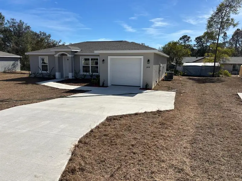 NEW CONSTRUCTION. MOVE-IN READY! This Largo Model is a 3 bedroom, 2 bathroom home offering 1,264 square feet of comfortable living space, set on a spacious 0.19 acre lot in Citrus Springs. Built with solid concrete block construction, a 30-year architectural shingle roof, and energy-efficient double-pane windows, this home also comes with a 10-year structural warranty for added peace of mind. Inside, the living room features a vaulted ceiling that creates an open and airy feel, and luxury vinyl plank flooring flows throughout the home. The kitchen is designed for everyday living with stainless steel appliances, custom white shaker cabinets with soft-close drawers, granite countertops, and a practical pantry. The master bathroom includes a glass-enclosed shower, while the main bathroom offers a tub and shower combo, both finished with granite countertops. The washer and dryer are located in the one-car garage, which has an opener and remotes, plus an extra parking pad for convenience. With no HOA fees, you have true ownership freedom, and the home is located in flood zone X, meaning it is high and dry with no flood insurance required.