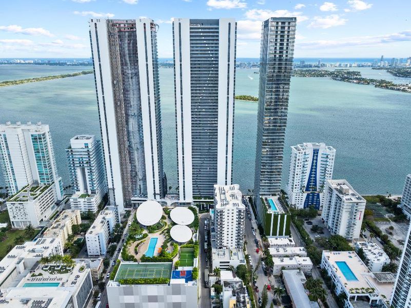 Stunning, never-lived-in new construction. Arrive by elevator into an exclusive entry foyer and step into a light-filled corner home with unobstructed views of Biscayne Bay, the Miami skyline, and the ocean. East-to-west exposure delivers breathtaking sunrises and sunsets. Features include an upgraded kitchen, new designer lighting package, 24x48 porcelain tile flooring, built-out closets, and motorized shades throughout. The layout includes a versatile den and an additional private entry. Enjoy 10-ft floor-to-ceiling windows and an extraordinary 291-ft terrace overlooking the water. Aria Reserve amenities offer a resort-style pool, spa, cabanas, courts, and lush landscaped grounds. Move-in ready waterfront luxury.