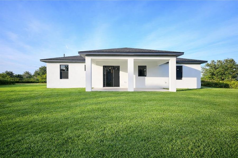 Beautiful new construction home located on a desirable corner lot in Lehigh Acres, conveniently near LaBelle and the Homestead area of Lehigh. This 3-bedroom, 2-bath residence offers 1,384 sq ft under air with a 2-car garage and a modern open layout enhanced by high vaulted (volume) ceilings, creating a bright and spacious feel throughout. The home features impact-resistant windows and doors and losa tile flooring throughout the entire home, including the garage, lanai, and front porch, providing a sleek, cohesive, and low-maintenance finish. The kitchen offers a functional L-shaped design with double entry access and flows seamlessly into the main living area—perfect for both everyday living and entertaining. The primary bathroom is thoughtfully designed with a walk-in shower featuring multiple shower heads, elegant finishes, and a modern LED mirror and dual sinks. The primary bedroom includes custom closet cabinetry, with additional built-in closet cabinets in one of the secondary bedrooms, offering excellent storage solutions. Additional highlights include a paved driveway with pavers, automatic irrigation system, tiled garage, open lanai, washer and dryer, and all appliances included. With its corner lot location, quality upgrades, and proximity to LaBelle, SR-80, and major connecting roads, this brand-new home offers modern comfort, durability, and convenience in a rapidly growing area of Lehigh Acres with no HOA.