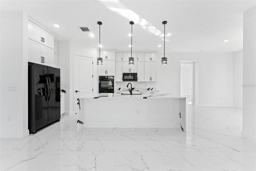 The heart of the home is the expansive open living area, where the living room, dining space, kitchen, and breakfast nook flow seamlessly together. The designer kitchen is a showstopper, featuring custom cabinetry, stone countertops, and beautiful tile throughout—perfect for everyday living and entertaining alike.