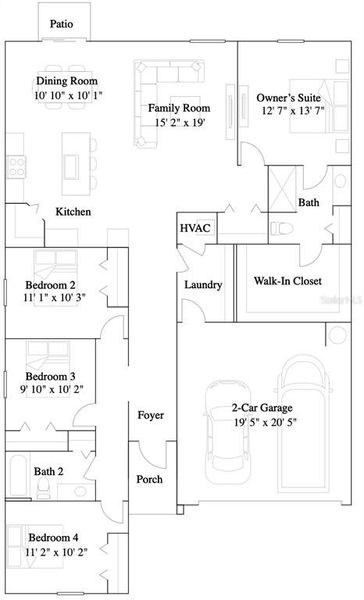 This new single-level home boasts a low-maintenance layout. Off the foyer, an open-concept floorplan combines the kitchen with the living and dining areas, and a convenient patio offers seamless indoor-outdoor transitions. Three bedrooms are tucked away to the side of the home, including the luxe owner’s suite in a private back corner.