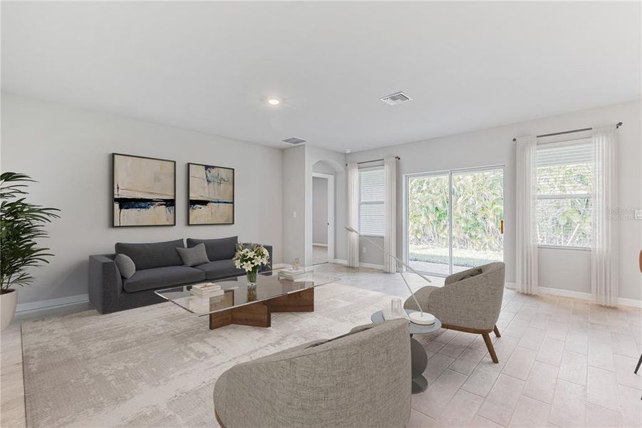 At the end of the foyer, the home showcases the expansive open-concept floorplan including the kitchen with quartz counter tops, living room, and dining room. The living room overlooks a covered patio, perfect for outside dining or entertaining in the beautiful Florida weather with impact storm windows throughout.