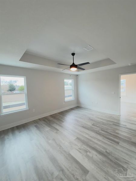 Upon entering the home, you will notice that there is vinyl plank flooring throughout the entire home. The living room is spacious and has a ceiling fan as well as a closet for household items. Exiting from the living room, you enter the kitchen at the back of the home. Within the kitchen, you have beautiful granite countertops and stainless steel appliances. There is a counter-height bar for additional seating and makes entertaining easy while cooking in the kitchen. The dining area is part of the kitchen and is separated by the counter-height bar. In the dining area, you have a single French door that leads onto a patio that is perfect for grilling or stargazing on one of those clear Florida evenings. The master bedroom is off of the dining area with a tray ceiling, ceiling fan and contains a walk-in closet. The master bath has double sinks with granite countertops and has a tub/ shower combo. The additional two bedrooms are ample size and share a bath within their hallway. The hall bath has a single sink and shower/ tub combo. There is an inside laundry room within the hall and a linen closet for additional storage. The double car garage has a garage door opener and attic access.