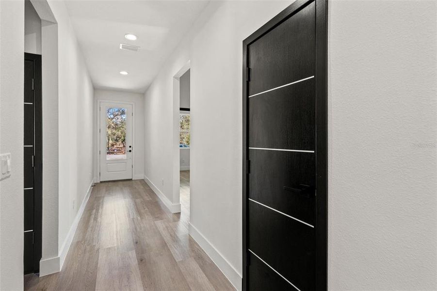 Luxury waterproof LVP flooring flows throughout, (NO CARPET!) paired with upgraded solid-core designer doors, a premium feature rarely found in competing listings. The split floor plan offers excellent flexibility with two bedrooms and a full bath near the front of the home, a third bedroom with its own full bath and walk-in closet—perfect for guests or a private suite—and a full laundry room with Samsung washer and dryer included.