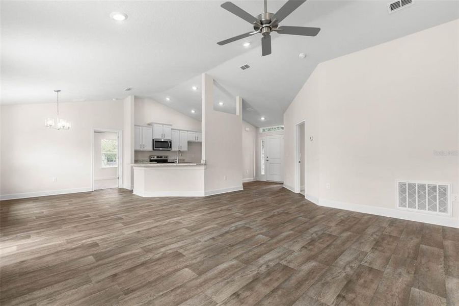 The main living areas have vaulted ceilings, which help create a sense of space and openness.