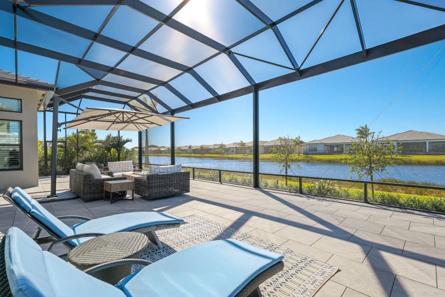 Coastal chic at Valencia Grand - a 55+ resort-style community | Lakefront expanded Carmel model boasting 3 BR + Clubroom (4th BR) + Office/Den + Hobby room + 4 BA. Set on nearly a 1/4 acre lot, this home offers a chef's kitchen w/gas cooking, island, walk-in pantry, wide-plank wood flooring, + a custom fireplace. Primary suite w/two walk-in closets, a spa-like bath w/separate vanities, glass shower, + a soaking tub. Clubroom w/water view + a smart trundle bed for xtra guests. The stylish Office/Den boasts a custom-built desk + cabinetry. Hobby room/play area/xtra guest quarters. Fully-screened lanai w/outdoor kitchen, west-facing lake view + sunsets, + lush landscaping + lighting. Crown molding | Plantation shutters | Soaring ceilings | Laundry room | Mudroom | 2-car garage. Resort-style amenities include clubhouse, patio bar and eatery (Prime 92 Fifty), bocce ball, tennis, pickleball (indoor + outdoor), multiple pools, state-of-the-art fitness center, locker rooms, spa + salon, card salons, and a variety of social programming throughout the year.