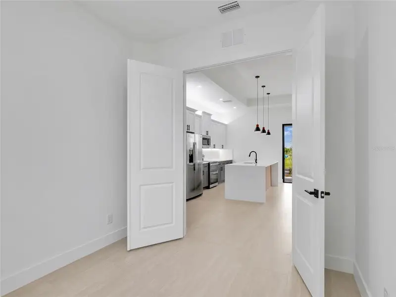 Brand-New Construction - Move-In Ready! This beautifully designed 3-bedroom + den, 2-bath home is ready for immediate occupancy in one of Cape Coral's most sought-after neighborhoods. Enjoy serene freshwater views right from your backyard. The home features: • A sleek modern kitchen with quartz waterfall island and premium stainless steel appliances • Soaring ceilings that enhance the open, airy feel • A spacious laundry room with a folding area and generous cabinetry • Impact-resistant doors and windows for safety and peace of mind • No Flood Insurance Required!