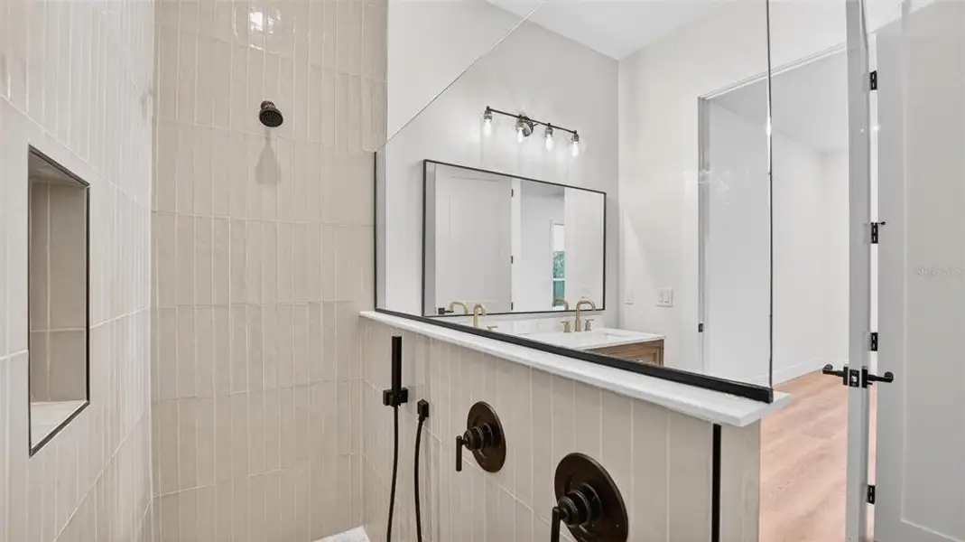 One or more photo(s) was virtually staged. Welcome to this stunning new construction semi-custom home located at 257 Lago Vista Street! Designed with modern living in mind, this 3 bedroom, 2 bath split floor plan home combines high-end finishes, thoughtful functionality, and inviting indoor-outdoor spaces—perfect for today’s Florida lifestyle. Step inside and immediately notice the open, airy feel created by 10-foot ceilings, 8-foot interior doors, and luxury vinyl plank flooring flowing throughout the home. The open-concept living area connects seamlessly to the kitchen, making this home ideal for everyday living and entertaining. The chef’s kitchen is a true focal point, featuring quartz countertops, a dramatic waterfall-edge kitchen island with eat-in seating, and a bronze-finished pot filler above the stove—a rare and stylish upgrade. A large walk-in pantry offers exceptional storage and includes a built-in countertop, additional cabinet drawers, and a designated space for a wine refrigerator, blending convenience with custom appeal. This split floor plan provides privacy for the primary suite, which serves as a relaxing retreat. The primary bedroom includes a large walk-in closet and a spa-inspired en suite bathroom with double sinks, a modern walk-in shower, contemporary fixtures, and a private toilet closet. Quartz countertops continue in both bathrooms, maintaining a cohesive and elevated design throughout the home. Additional highlights include a separate interior laundry room, giving you a dedicated space that’s both functional and tucked away from main living areas. Outdoor living is just as impressive. The home welcomes you with a covered front porch accented by beautifully stained wood pillars, adding warmth and curb appeal. In the back, French doors open to a spacious covered lanai with ceiling fans, creating the perfect setting for entertaining, relaxing evenings, or enjoying Florida’s year-round sunshine. This new build offers the charm of a semi-custom home paired with modern efficiency and quality craftsmanship. It is in close proximity to lakes, parks, shopping, only minutes to historic downtown Sanford along with easy access to major highways. With designer finishes, thoughtful upgrades, and a layout that lives beautifully, this home stands out among new construction homes in DeBary, FL. and is a must-see!