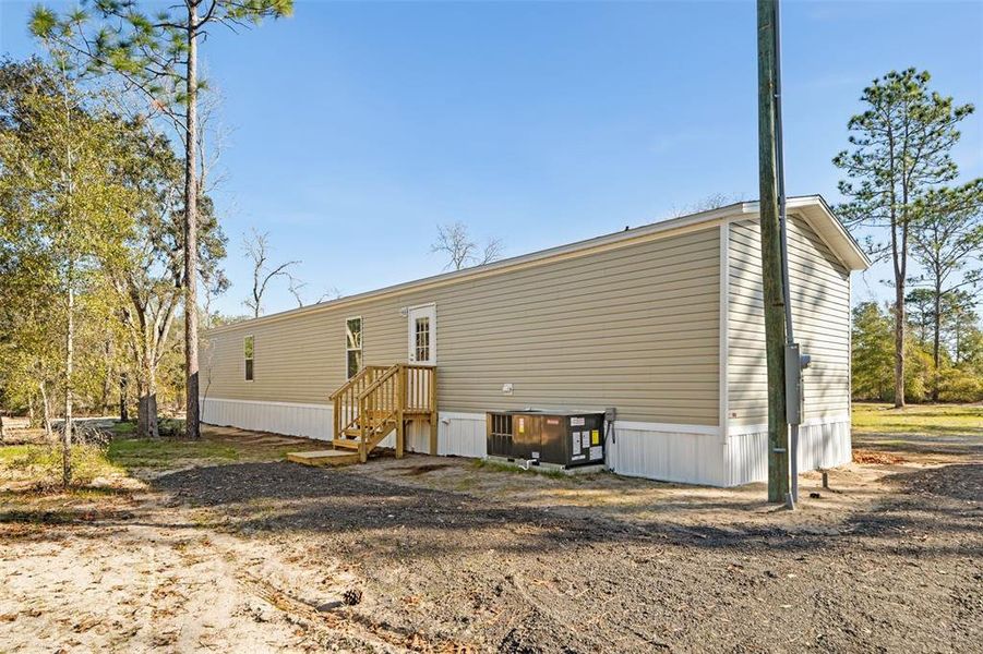 Brand-new 3BD/2BA Champion manufactured home on .92 acres in Bronson, FL—move-in ready and thoughtfully designed for comfort, efficiency, and durability. Offering 1,153 sq. ft. of well-planned living space, this home is built to Wind Zone II standards and Energy Star certified, providing peace of mind and long-term value. The open-concept layout seamlessly connects the kitchen, dining, and living areas, creating a bright and functional gathering space. The kitchen is equipped with Whirlpool appliances, including a range/hood, refrigerator, and dishwasher. Additional features include an energy-efficient Rheem hot water heater, a brand-new well and septic system, fresh millings driveway, professional landscaping for curb appeal, and a one-year home warranty. Enjoy the tranquility of rural living while remaining conveniently close to Gainesville for shopping, dining, healthcare, and entertainment. Outdoor enthusiasts will appreciate nearby attractions such as Devil's Den Spring, Black Prong Resort, Cedar Lakes Woods and Gardens, and the Goethe State Forest. Notably, this property is located next door to another newly constructed manufactured home currently available for separate purchase, presenting a unique opportunity for buyers seeking multi-generational living, extended family proximity, or investment flexibility—while still enjoying the privacy of separate parcels. Schedule your private showing today and experience the perfect blend of modern amenities and country charm at 5370 NE 108th Ter, Bronson, FL 32621.