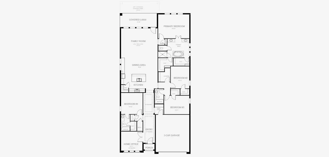 Step off the front porch and into a welcoming entryway with an extended tray ceiling that embraces the main hallway. French doors open into a secluded home office that overlooks the front yard. A full guest suite with a private bathroom and ample closet space is off the main hall. The kitchen features an island with built-in seating, and corner walk-in pantry. The dining area flows from the kitchen to the connecting family room which offers plenty of natural light from its sliding glass doors and access to the backyard covered lanai. The primary bedroom has three large windows overlooking the backyard space. Double doors lead into the bathroom which hosts dual vanities, a freestanding tub, glass enclosed shower, and two walk-in closets. Two secondary bedrooms and the laundry room complete the floor plan. The drop zone is located off the two-car garage.