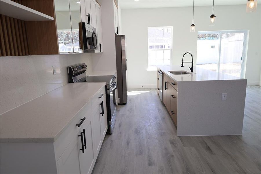 The chef-inspired kitchen is fully equipped with stainless steel appliances, including a range, refrigerator, dishwasher, and microwave. Enjoy the convenience of a large island, abundant shaker-style cabinetry, and elegant quartz countertops with waterfall edges. A stylish backsplash and feature wall add a luxury touch to the space.
