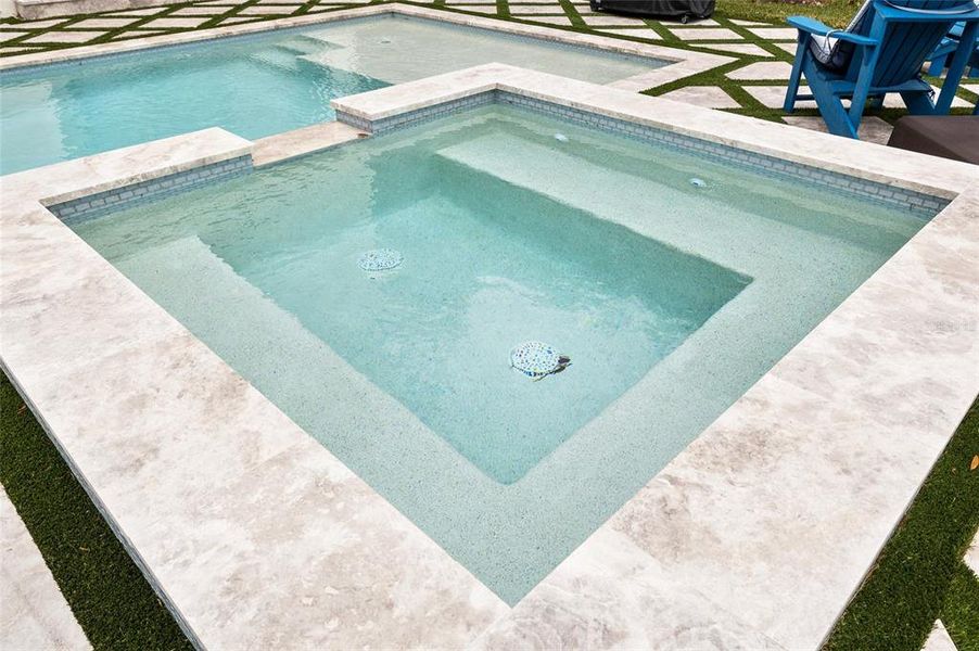 Designed for Florida living, the backyard is an entertainer’s dream. A heated 12’ x 24’ saltwater pool with sun shelf and a 7’ x 7’ spa is surrounded by a diamond-pattern travertine deck with turf inlays, creating a private oasis for both relaxing and hosting unforgettable gatherings.