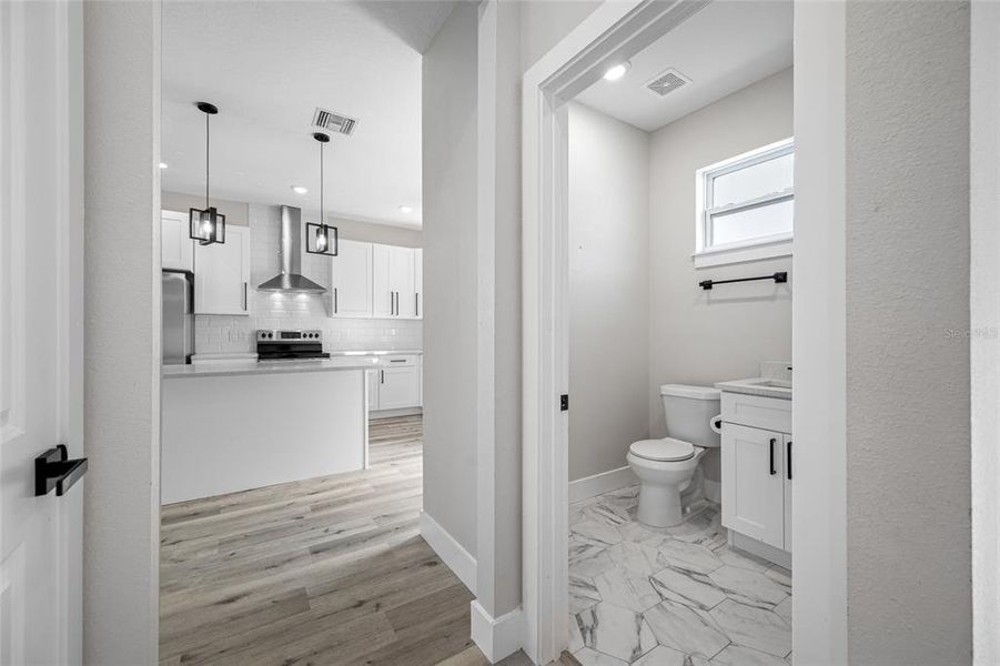 Walk in the main home to an expansive dining area creating the perfect setting for entertaining, complemented by a designer kitchen with quartz countertops, shaker cabinetry, stainless steel appliances, and an oversized breakfast bar. Wide-plank luxury vinyl flooring throughout both levels delivers a clean, upscale aesthetic. Upstairs, the spacious primary suite offers a private retreat with a large walk-in closet and a spa-inspired ensuite bath featuring a double vanity and glass-enclosed shower. Two additional bedrooms provide versatile space for family, guests, or a home office. A conveniently located laundry closet with washer and dryer connections is situated in the upstairs hallway.