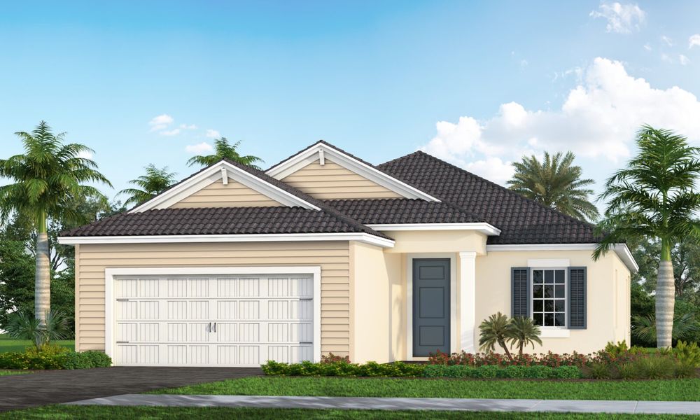 With 3 bedrooms, 2.5 baths, and 2,064 sq. ft. of open living space, the White Star is a home built for entertaining guests or daily relaxation. At the front of the home is a formal dining room connecting to the kitchen area, allowing dishes to have a beautiful display as they are brought to the table. This space is den or comfortable leisure room if preferred. The inviting great room is open to the island kitchen and charming café area, perfect for unwinding over refreshments while enjoying the sight of the outdoor lanai with a pool professionally designed by Waterscapes.