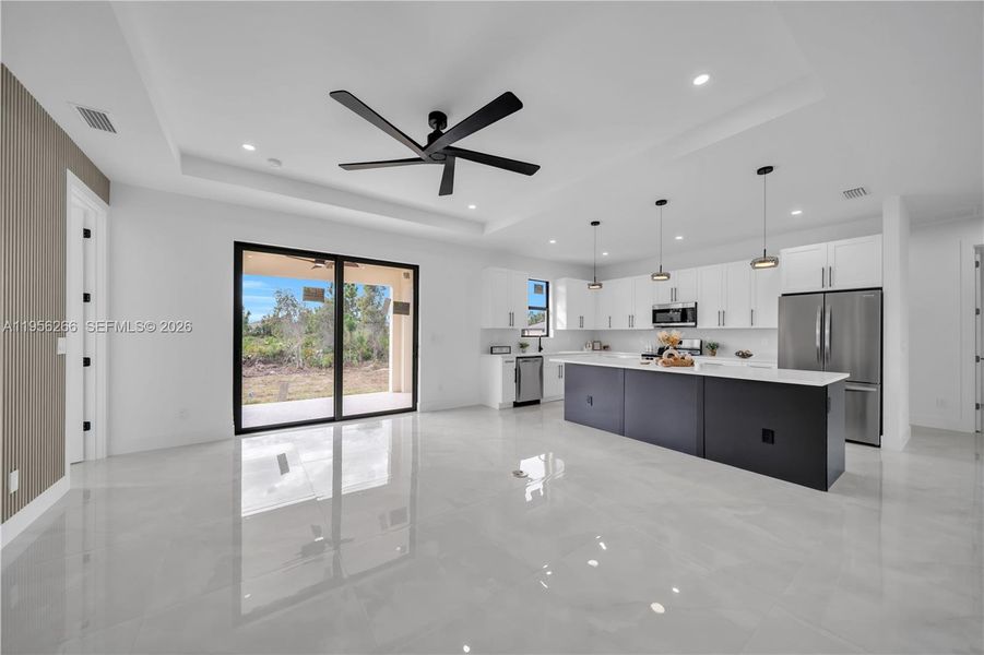 BRAND-NEW HOME • MODERN FINISHES • MOVE-IN READY This new construction 4 bed / 3 bath home offers 2,391 sq ft total (1,778 under A/C) with a 2-car garage and a layout that just makes sense. High ceilings, porcelain tile throughout, and a bright open living space make it feel clean and welcoming from the moment you walk in. The kitchen stands out with a large quartz island, full backsplash, under-cabinet lighting, new appliances, and a walk-in pantry — perfect for everyday living and hosting. The primary suite features a spa-style bath, plus a second master ideal for guests or extended family. Bedroom #4 works great as a home office. Enjoy Florida living with 8-ft sliding doors to an extended lanai, epoxy floors in the garage and lanai, impact windows and doors, paver driveway, and a modern water filtration system. Easy to love. Come see it and make it yours.