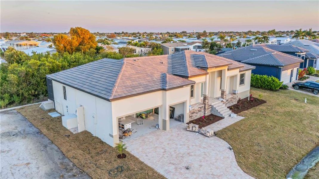 Welcome to Windward Isles, Punta Gorda’s newest maintenance-free waterfront community featuring 24 luxurious sailboat-access homes! This under-construction, never-lived-in residence offers a modern split-bedroom floor plan with high-end finishes and exceptional attention to detail throughout.This spacious home features three generous bedrooms, three full bathrooms, a formal dining area, massive great room, and a versatile bonus den/office. The gourmet kitchen is designed for both style and functionality, including 42” wood upper cabinets with accent glass inserts, a tiled backsplash, granite countertops, and a full stainless steel appliance package including a hood, oven, microwave, cooktop, refrigerator, and dishwasher. The luxurious master suite includes an expansive master bathroom with dual vanity, tiled shower, and large walk-in closet. Interior highlights include porcelain tile flooring throughout, an electric built-in fireplace, tall ceilings with recessed trays, coffers, and grids, crown molding, designer fixtures, and 5” baseboards. Step outside to your private outdoor oasis featuring a covered paver lanai, heated pool and spa, and 90-degree sliding glass doors that maximize natural light and views of the picturesque canal. The exterior boasts a seawall with boat lift and wood dock, perfect for boaters, along with a paver driveway and walkway, stone accents, high-impact windows and doors, tiled roof, irrigation system, and lush landscaping. Windward Isles offers a maintenance-free lifestyle with HOA-covered services including lawn care, irrigation, tree trimming, pest control, and fertilization. Located just minutes from Charlotte Harbor and the Gulf of Mexico, with easy access to Boca Grande, Fisherman’s Village, and Downtown Punta Gorda, and close to dining, shopping, and entertainment, this is the ideal place to call home.