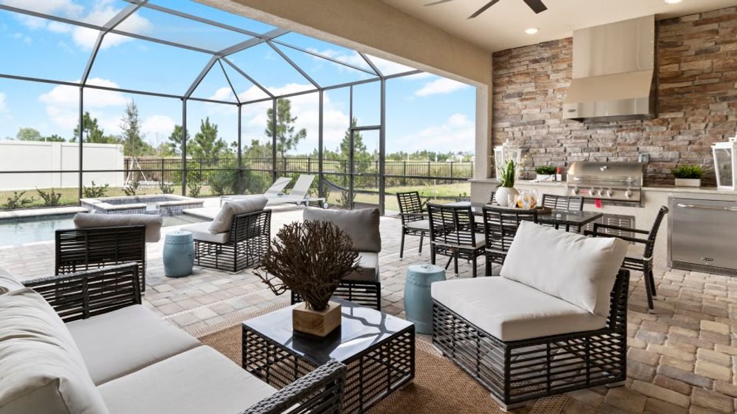 This new single-story home enjoys a cohesive modern design uniting the spacious kitchen, family and dining rooms that are ideal for shared living. An expansive lanai is accessible from the family room and the spacious owner’s suite, while a den and secondary bedroom in the front of the home add flexibility.