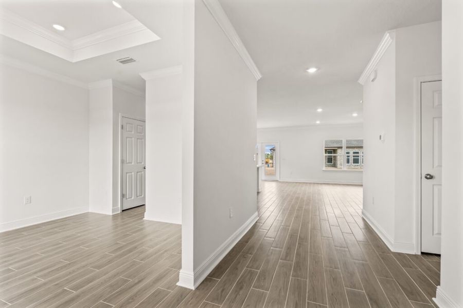 Welcome to the Crystal, a beautiful floorplan from the Cornerstone collection by Holiday Builders. This thoughtfully designed home offers a harmonious blend of style, functionality, and comfort. Upon entering the foyer, you’ll notice a den on the left, providing a versatile space that can be used as a home office, study, or even a fourth bedroom. To the right, a formal dining room awaits, creating an elegant setting for hosting dinner parties or enjoying special meals with loved ones. Just beyond the den, a corridor leads to a private kids or guest wing of the home. This wing encompasses two bedrooms, a full bathroom, and a convenient laundry room with access to the two-car garage. The presence of a linen closet in the hallway adds practicality and storage options. Returning to the foyer, you’ll be greeted by the spacious great room, which serves as the central hub of the Crystal floorplan. This open and inviting space seamlessly connects to the breakfast area and kitchen. The great room provides ample space for relaxation and entertainment, ensuring quality time with family and friends. The kitchen features an island with a sink and dishwasher, offering a functional workspace and a gathering place for casual meals or socializing. A pantry provides additional storage in the corner of the kitchen, while the entrance to the dining room promotes easy access for serving and entertaining. The owner’s suite is conveniently located on the other side of the great room, providing a private retreat within the home. This serene space encompasses a large walk-in closet and a linen closet in the owner’s bathroom, offering plenty of storage solutions. The owner’s bathroom provides a tranquil sanctuary, allowing you to unwind and recharge. With 2,187 square feet of living space, the Crystal offers comfortable and spacious accommodations for your family. Its well-designed layout promotes efficient use of space while maintaining a sense of openness and connectivity. At Holiday Builders, we understand that your dream home should reflect your unique style and preferences. That’s why we offer the freedom to personalize your new home with design options and upgrades. Alternatively, you can select a move-in ready home that has been expertly crafted and awaits your arrival. Explore our Cornerstone collection and discover the floorplan that best suits your lifestyle. With the Crystal, you’ll find a home that combines functionality, elegance, and comfort, allowing you to embrace the Holiday style of living. Start your journey to a dream home with Holiday Builders today.