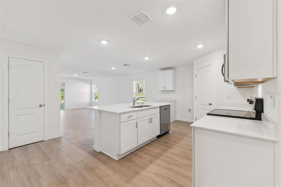 The kitchen stands out with its modern finishes, including an island, quartz countertops, and stainless-steel appliances, all designed to make cooking and gathering effortless.