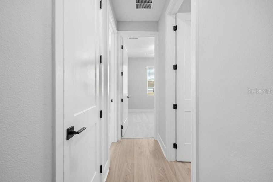 The private owner’s suite is tucked quietly toward the rear of the home, offering a peaceful retreat. The generous bedroom provides ample space for a sitting area or statement furnishings, while large windows invite in soft natural light. The spa-inspired bath features dual vanities, a walk-in shower, and two spacious walk-in closets for exceptional organization. Secondary bedrooms are positioned on the opposite side of the home, offering both privacy and flexibility.