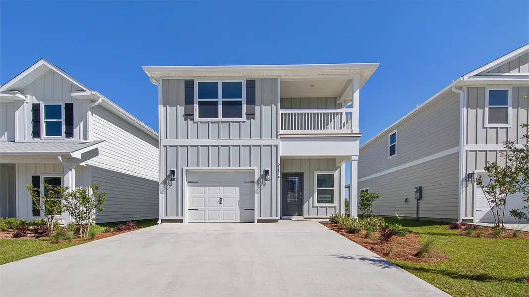 Welcome to 1825 Backwater Road, a new home floor plan located at Windmark Beach in Port Saint Joe, Florida. This floor plan features two stories with three bedrooms and two and a half bathrooms. The exterior of this home features a covered front porch on the main level and a covered balcony on the second level just off the primary bedroom.