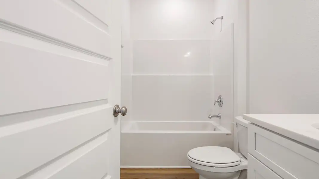 The primary bedroom is located at the back of the home offering a private retreat and it features an ensuite bathroom with EVP flooring, quartz countertops and beautiful white cabinetry. The bathroom is designed with two spacious closets, a large shower with glass enclosure and a dual sink vanity.