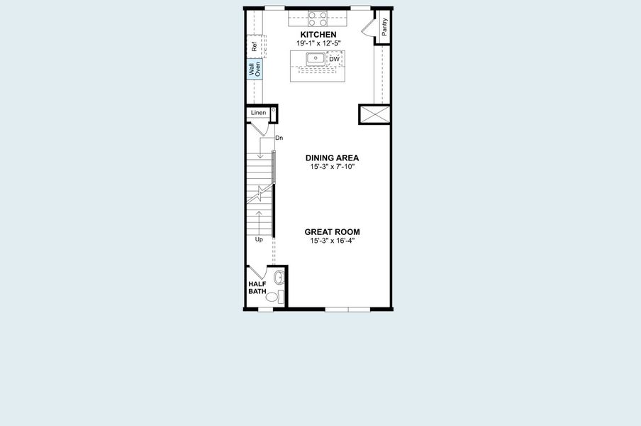 Open great room, dining & kitchen beneath an airy layout