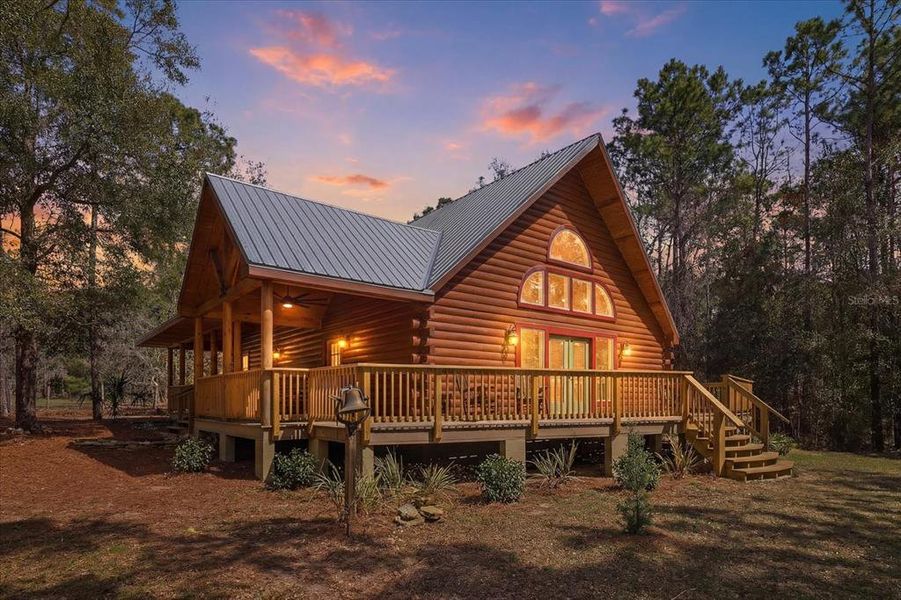 Welcome to this one-of-a-kind new construction log cabin located just 300 feet from the Withlacoochee State Forest trails, offering direct access to over 52,000 acres of hiking, equestrian trails, and road system within the Citrus Wildlife Area tract and Tillis Hills Campground, all while being situated on a quiet dead-end road. In addition, there are more than 50 miles of horse trails. This beautifully crafted two-story home features 3 bedrooms and 3.5 bathrooms, including a unique Jack-and-Jill master bathroom design, and showcases custom carpentry and rich wood finishes throughout. Originally sourced from North Carolina, the authentic log structure features pine wood that has been professionally stained and clear coated, highlighting the natural character of the home. Large picturesque windows flood the interior with natural light, perfectly complementing the rustic charm and craftsmanship. The kitchen features a custom-made cherry wood island paired with granite countertops, creating a warm and functional gathering space. The loft area was thoughtfully designed to accommodate a regulation-size pool table and includes an electrical box above for billiard lighting, making it an ideal entertainment or recreation space. The foundation is built with oversized footers and a 3-foot slab crawl space. The home also includes acoustic insulation in the first-floor walls for added comfort, termite treatment completed with the slab for protection, a durable metal roof, and a wrap-around porch ideal for enjoying the peaceful surroundings. Modern systems include two HVAC units—a 3.5-ton Goodman heat pump serving the first floor and a 2-ton unit for the second floor—an AO Smith Signature 100-gallon water heater, a Viqua ultraviolet water system installed in July 2023, and Spectrum high-speed internet installed. Surrounded by large mature oak trees, the property offers exceptional privacy and a true Old Florida setting. The property is fully equipped for equestrian and recreational living, with perimeter and cross fencing, a 37-foot wooden round pen, two wooden paddocks, and three additional RV hookups with electric and water already in place. A detached 30x60 (1,800 sq ft) shop with a 6-inch concrete slab and oversized footers offers post and beam construction with 12-inch rafters and 6-inch studs, 100-amp electric service, water, two 10-foot roll-up doors, a 30x12 lean-to with concrete flooring, and satellite. An additional on-site cabin adds further flexibility and potential as a rental or Airbnb opportunity. This exceptional property blends rustic elegance, quality construction, and unmatched access to nature, creating the perfect private homestead, equestrian retreat, or recreational escape. Call Today!