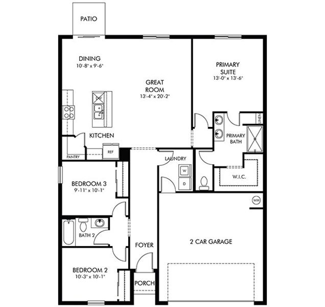 The Bluebell floorplan showcases an open-concept design with 3 bedrooms, 2 bathrooms and a spacious 2-car garage. The kitchen seamlessly connects to the great room, dining nook, and outdoor patio, perfect for both everyday living and entertaining.