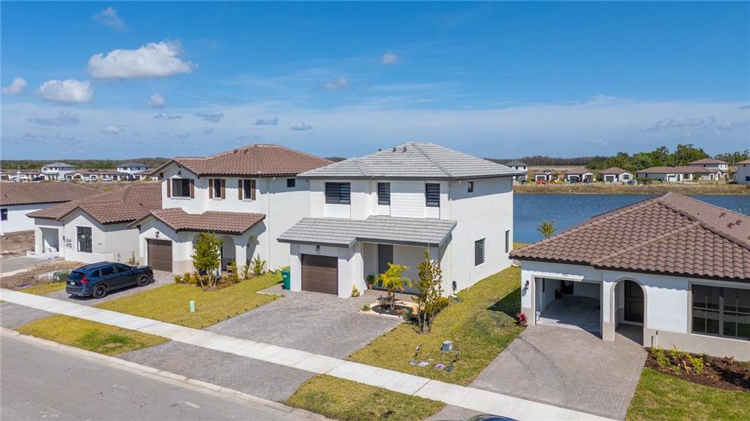Welcome to this beautifully upgraded 2025-built lakefront home in the heart of Ave Maria. Rarely lived in and meticulously maintained, this 3-bedroom, 2.5-bath residence feels like new construction — without the wait. Designed with both style and functionality in mind, this home features an open-concept floor plan with crown molding throughout the first floor, upgraded backsplash, designer pendant lighting, and 36-inch cabinetry with soffits and lighting. Two built-in wine racks add the perfect touch for entertaining. Enjoy seamless indoor-outdoor living with an extended patio overlooking serene lake views, plus remote-controlled blinds on the patio sliders and in the primary bedroom for added convenience and comfort. The upgrades continue with custom-built primary closets featuring wood plank accents, upgraded cabinet hardware throughout, built-in entryway cut-outs, and ample storage solutions — including built-in garage cabinetry. The extended driveway wraps around for convenient garbage can placement, adding both practicality and curb appeal. This move-in ready home combines thoughtful upgrades, modern finishes, and tranquil waterfront living-all in one of Southwest Florida’s most desirable communities. Residents indulge in resort-style living with access to a sparkling swimming pool, state-of-the-art fitness center, tennis courts, and picturesque walking and biking trails. Just minutes from Ave Maria’s inviting town center.