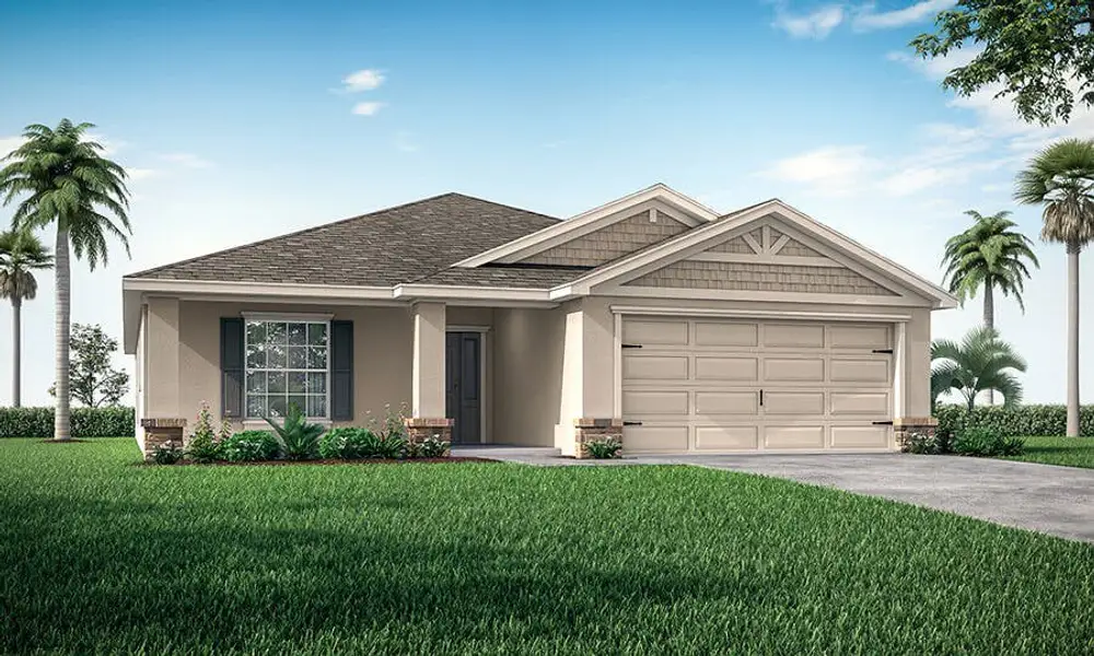 The Raychel features a sunny, open living area with volume ceilings, a spacious owner's suite with an elegant tray ceiling and a dual-vanity en-suite bath, and outdoor living space thanks to a front porch and covered lanai!