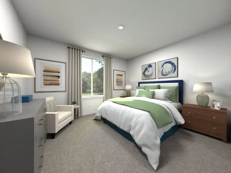 The Gardenia floorplan features an open-concept layout where the kitchen seamlessly connects to the dining area, great room, and outdoor patio. The private primary suite provides a spacious retreat for relaxation.