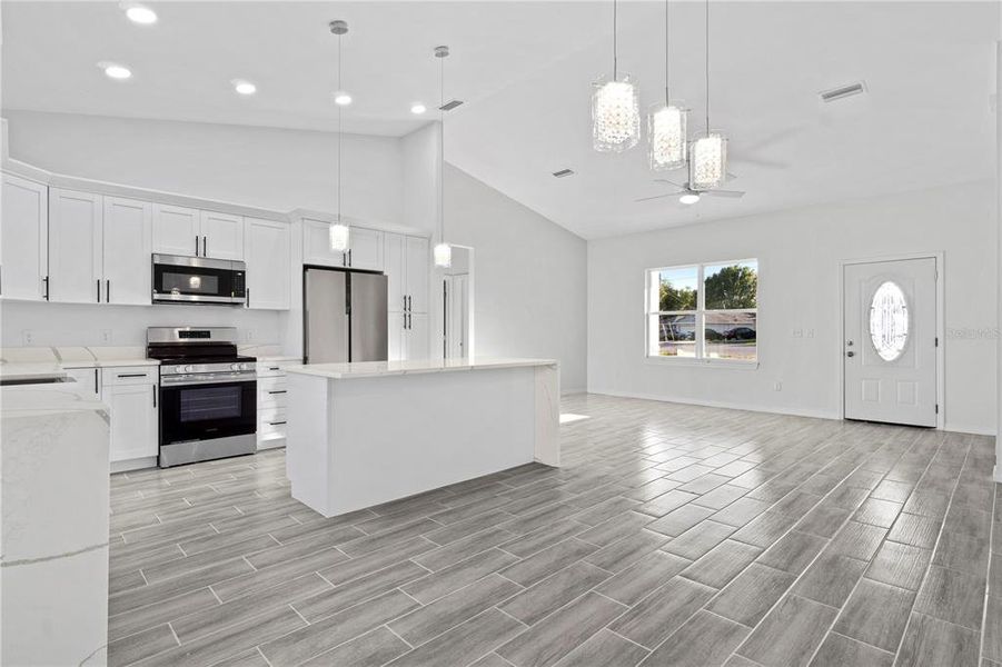 NO HOA ! Step into this beautiful home that is designed for comfort and style with vaulted ceilings. The primary bedroom offers a private retreat with vaulted ceilings. It also features an en suite with double vanity, walk in closet and a luxurious shower. The Kitchen is the focal point of the home with French doors that lead out to the Lanai. The Kitchen comes equipped with quartz counter tops and island with plenty of storage. Soft close cabinets and pantry. Laundry / mud room off the garage. Conveniently located in between Ocala's center of town and The Villages with plenty of golf courses and shops. Home is complete. Front view of home is from a previously built model. $3,000 in Concessions.