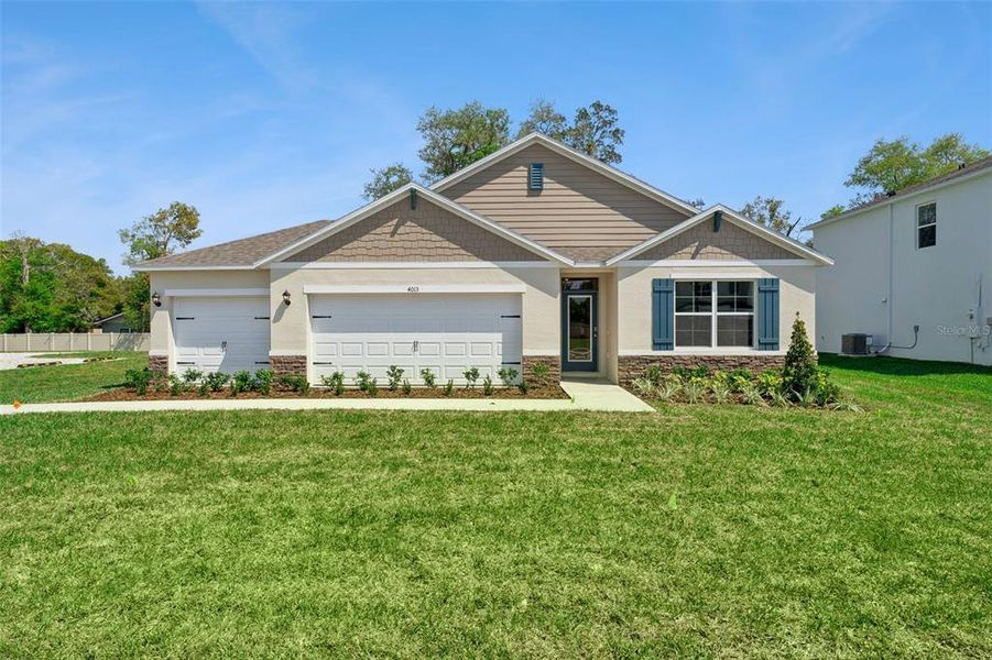 The popular one-story Cali floorplan offers 4-bedrooms, 2-bathrooms, a 2-car garage with 1,882 sq ft of living space. The open layout connects the living room, dining area, and kitchen, ideal for entertaining. The kitchen boasts quartz countertops, stainless-steel appliances, a walk in pantry and a spacious island. The four spacious bedrooms gives flexibility for various lifestyles. The primary suite located in the rear of the home features a private ensuite bathroom with dual sinks, a separate shower, and a walk-in closet. The remaining three bedrooms share one well-appointed bathroom, making morning routines a breeze. Laundry room is convenient to all bedrooms. This all concrete block construction home also includes smart home technology for control via smart devices.