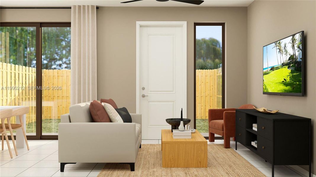 This new two-story townhome showcases an elegant clear glass impact-resistant entry door and windows. On the first floor is an open-concept layout shared among the kitchen, a spacious Great Room and a private fenced-in rear patio. On the same level is a bedroom suite well-suited to accommodating family members. Upstairs hosts the remaining three bedrooms, including the tranquil owner’s suite with a full-sized bathroom and an enviable private balcony to enjoy sunset views.