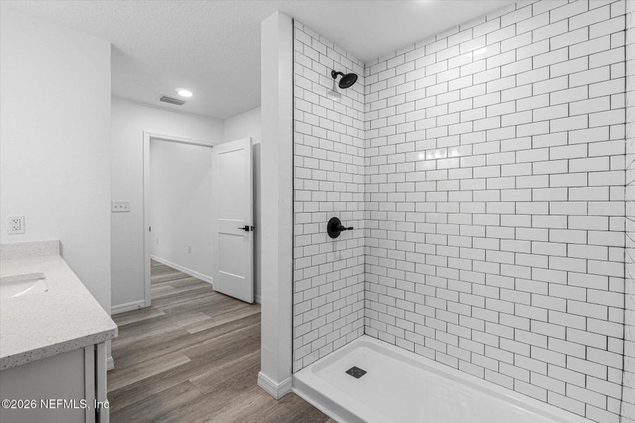 Master Suite: Vaulted ceilings, large walk-in closet, double vanity, and a tiled walk-in shower.