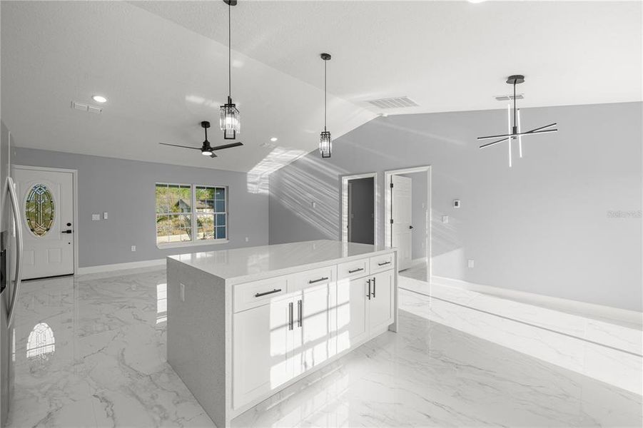 Welcome to this beautifully built new construction home in Rainbow Park, offering a perfect blend of style, functionality, and everyday comfort. This 3-bedroom, 2-bathroom residence showcases eye-catching curb appeal, thoughtful design, and the added advantage of no HOA or CDD fees. Positioned on a spacious corner lot, the property provides extra room and a sense of openness. Inside, you’ll find a bright and airy open-concept floor plan designed to maximize both living and entertaining space. Clean lines, modern lighting, and upscale touches enhance the overall aesthetic, while porcelain flooring throughout the entire home delivers a seamless, elegant finish that is both durable and easy to maintain. The kitchen is designed to impress, featuring sleek countertops, generous cabinet space, and a large island that serves as a natural gathering point. The split-bedroom layout ensures privacy, with well-sized secondary bedrooms and a conveniently located guest bathroom.